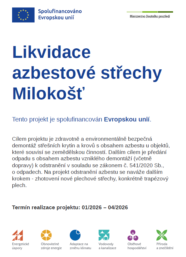 Aktuality Leden 2026LIKVIDACE AZBESTOVÉ STŘECHY MILOKOŠŤ Spolufinancován Evropskou unií. 22.08.2025Výdej naturálií bude probíhat v měsíci září ve dnech: čtvrtek 4.9.2025 8:00 - 13:30 čtvrtek 11.9.2025 8:00 - 13:30 čtvrtek 18.9.2025 8:00 - 13:30 čtvrtek 25.9.2025 8:00 - 13:30 Cena naturálií: pšenice 500,- Kč/q ječmen 500,- Kč/q V tyto dny bude probíhat i volný prodej obilovin. Cena komodit: pšenice 550,- Kč/q ječmen 550,- Kč/q 21.8.2024Výdej naturálií bude probíhat v měsíci září v tyto dny: 5.9.2024 8:00 - 13:30 12.9.2024 8:00 - 13:30 19.9.2024 8:00 - 13:30 26.9.2024 8:00 - 13:30 Cena komodit: pšenice 500,- Kč/q ječmen 500,- Kč/q